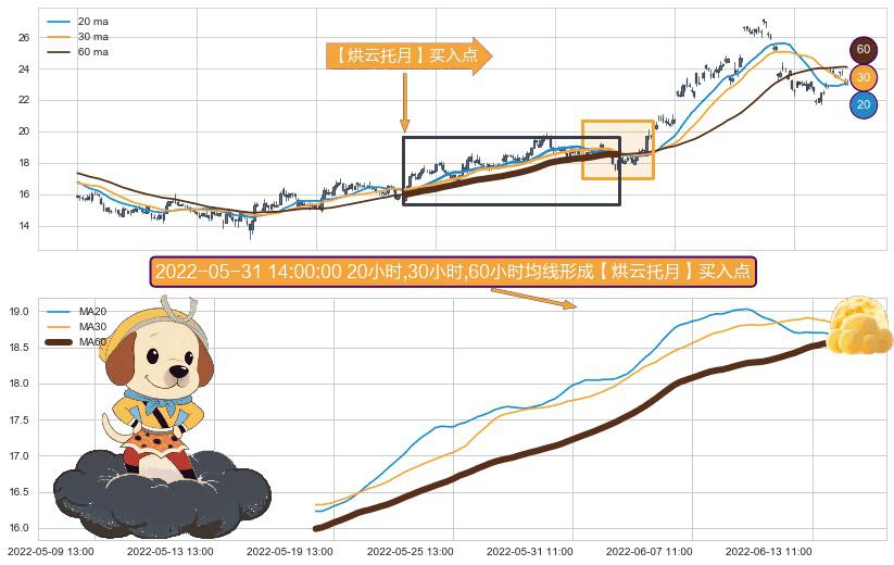 形态多维评估: ⚀ 2022-05-19 09:00:00小时-2022-06-14 13:00:00小时显现 20小时-30小时-60小时均线 【烘云托月】买入点 看多信号,后市看涨,买入