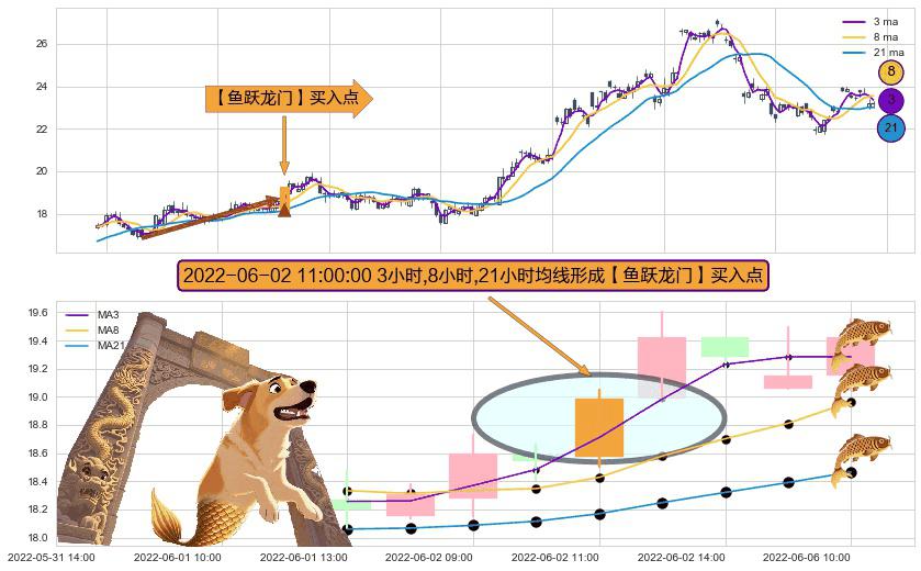 形态多维评估: ⚀ 2022-06-02 11:00:00小时显现 3小时-8小时-21小时均线 【鱼跃龙门】买入点 看多信号,后市看涨,买入