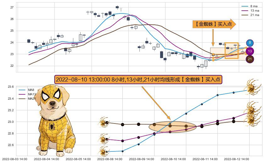 形态多维评估: ⚀ 2022-08-10 13:00:00小时显现 8小时-13小时-21小时均线 【金蜘蛛】买入点 看多信号,后市看涨,买入