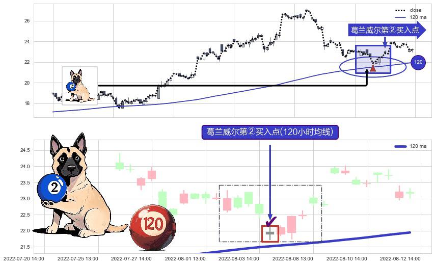 形态多维评估: ⚀ 2022-08-04 13:00:00-小时显现 葛兰威尔均线 120小时均线 第②买入点 上升趋势的中继信号,后市看涨,买进信号