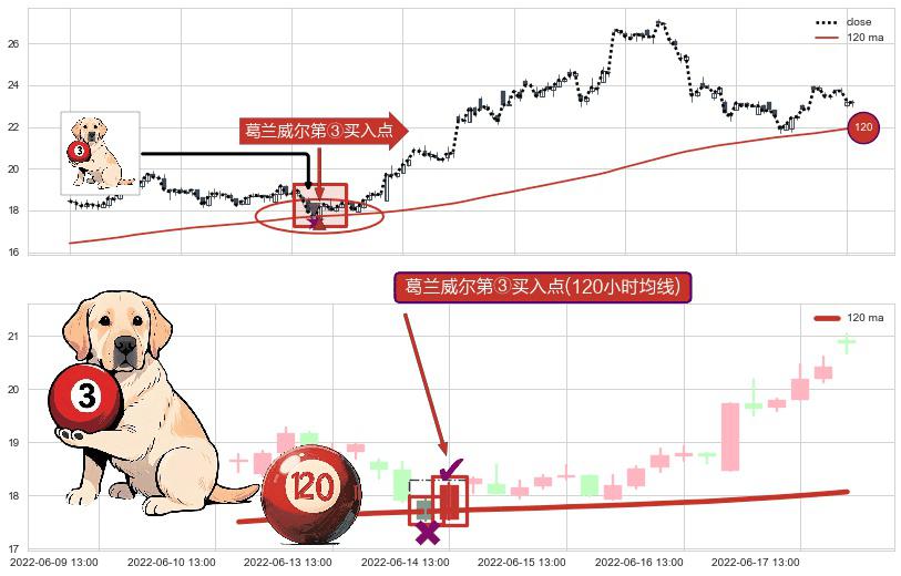 形态多维评估: ⚀ 2022-06-14 13:00:00-小时显现 葛兰威尔均线 120小时均线 第③买入点 上升趋势的中继信号,后市看涨,买进信号