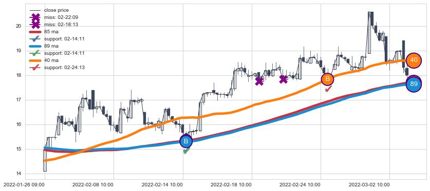 上涨趋势01-26 09:00-03-03 10:00,均线40, 89, 85确认关键支撑2处