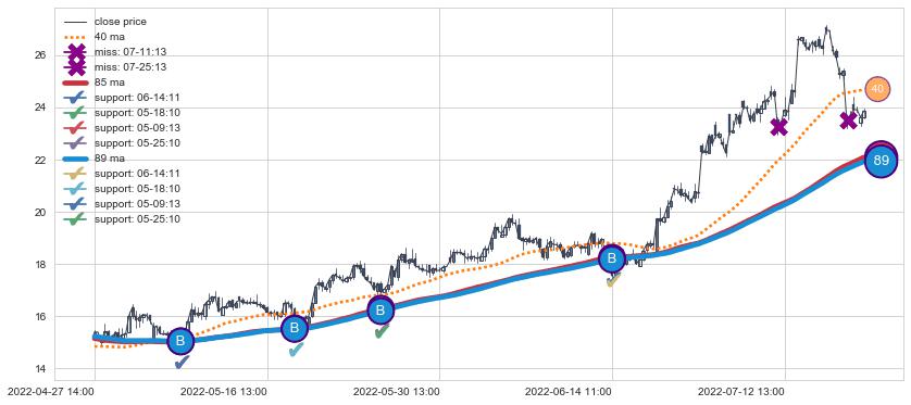 上涨趋势04-27 14:00-07-27 14:00,均线89, 85确认关键支撑4处