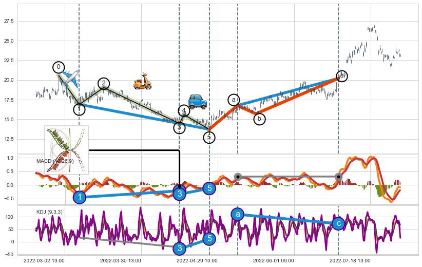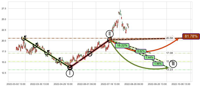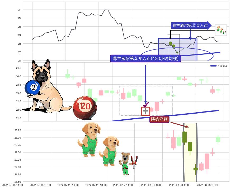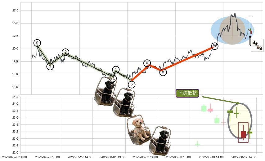 从2022-07-20 13:00至2022-08-12 14:00,共包含36个小时,阶段股价下跌-14.37%,阶段股价变动位移路程比: 1 : 3
