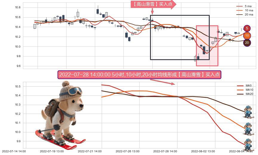 ⚀ 2022-07-21 14:00:00小时-2022-08-04 13:00:00小时显现 5小时-10小时-20小时均线 【高山滑雪】买入点 看多信号,后市看涨,买入