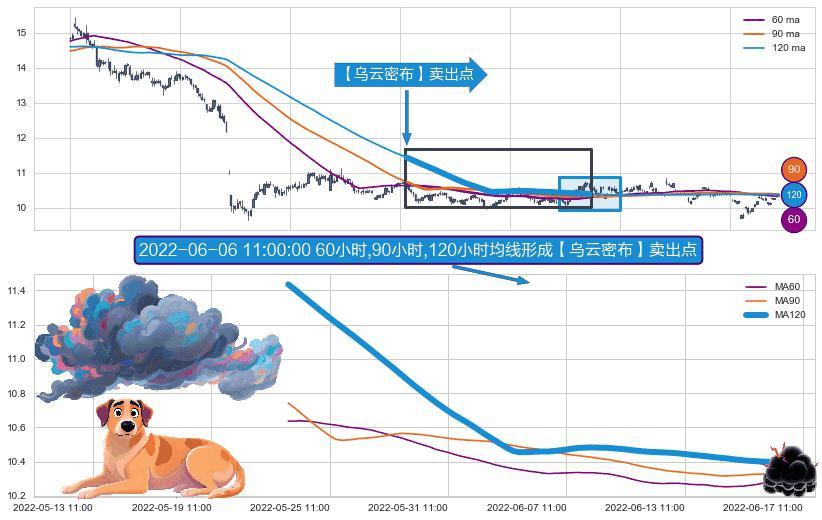 ⚀ 2022-05-24 09:00:00小时-2022-06-16 13:00:00小时显现 60小时-90小时-120小时均线 【乌云密布】卖出点 看空信号,后市看跌,卖出