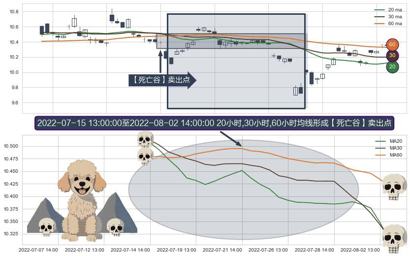 ⚀ 2022-07-15 14:00:00-小时至2022-08-02 14:00:00-小时显现 20小时-30小时-60小时均线 【死亡谷】卖出点 看空信号,后市看跌,卖出