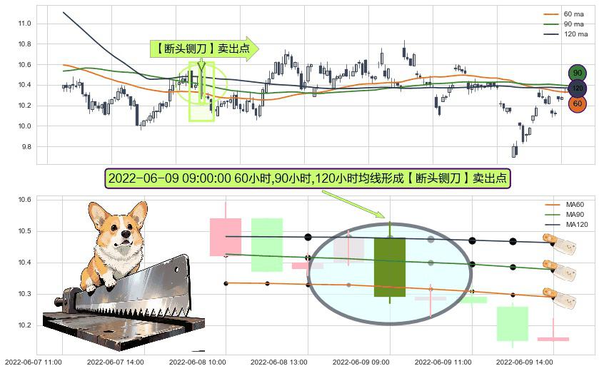 ⚀ 2022-06-09 09:00:00小时显现 60小时-90小时-120小时均线 【断头铡刀】卖出点 看空信号,后市看跌,卖出