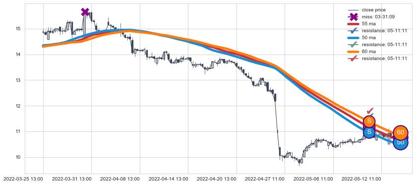 ⚂ 2022-06-29 13:00:00-小时均线向上突破,2022-07-22 13:00:00-小时重新下穿均线破位,均线阻力再次生效