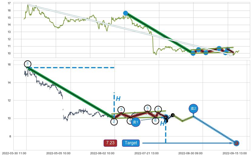 从2021-12-30 09:00至2022-08-12 14:00,共包含626个小时,阶段股价下跌-31.09%,阶段股价变动位移路程比: 1 : 15,下跌趋势角度: 54.8