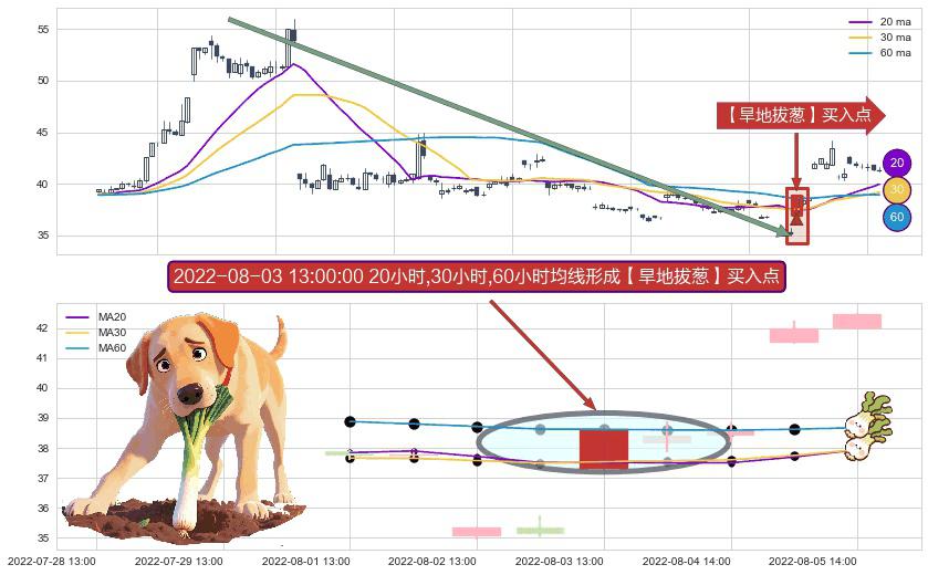 形态多维评估: ⚀ 2022-08-03 13:00:00小时显现 20小时-30小时-60小时均线 【旱地拔葱】买入点 看多信号,后市看涨,买入