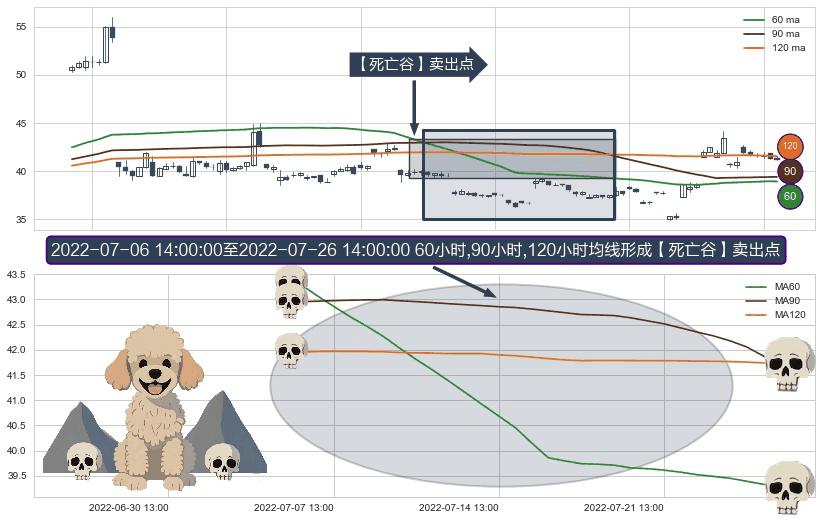 ⚂ 【死亡谷】卖出点 由MA60均线下穿MA90均线和MA120均线,MA90均线下穿MA120均线形成