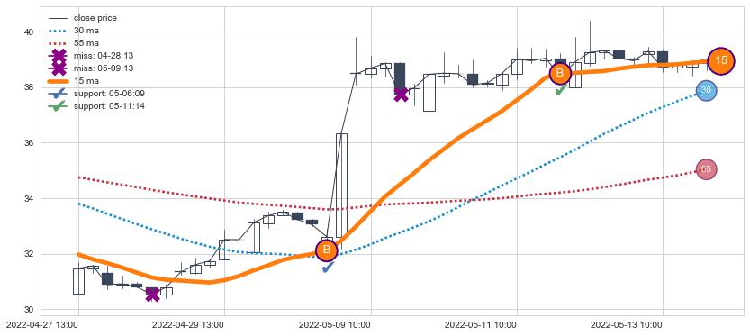 上涨趋势04-27 13:00-05-13 14:00,均线15确认关键支撑2处