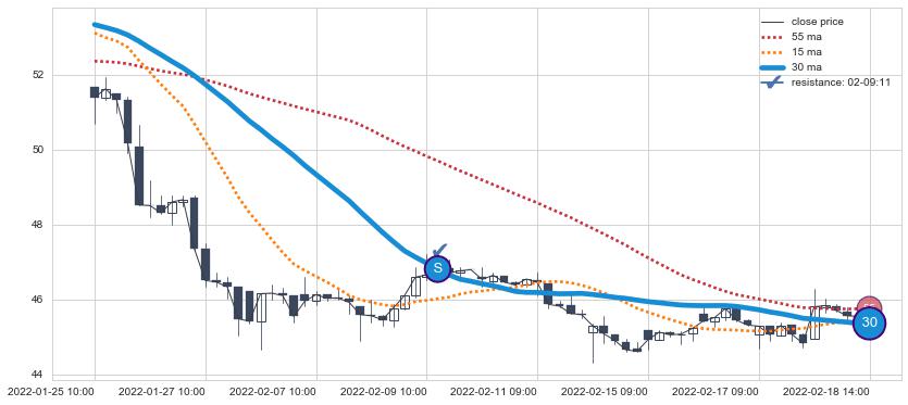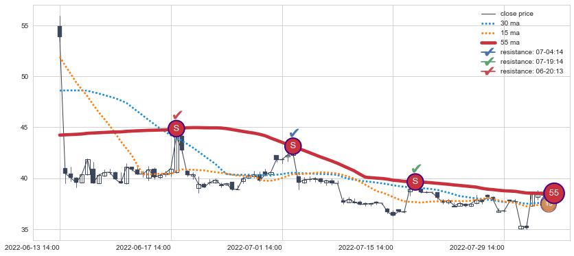 下跌趋势06-13 14:00-08-04 14:00,均线55确认关键阻力3处