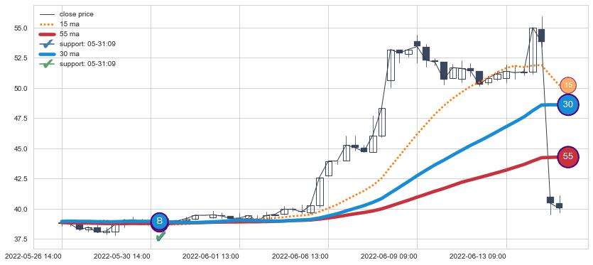 上涨趋势05-26 14:00-06-14 10:00,均线30, 55确认关键支撑1处
