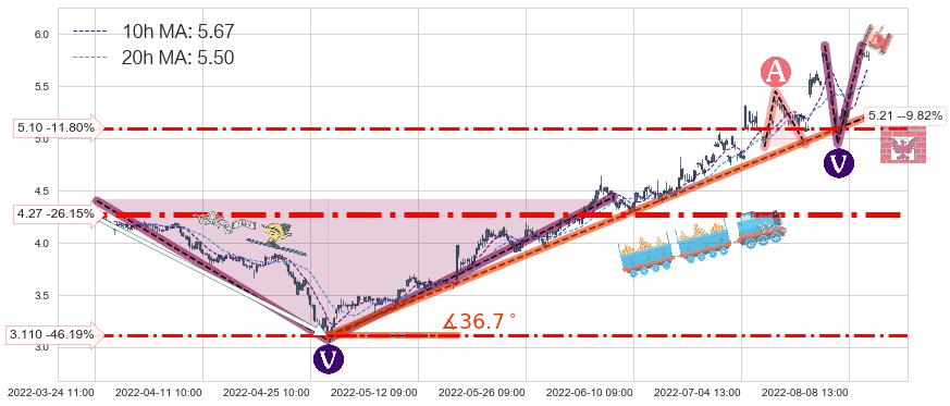 从2022-04-26 14:00至2022-08-03 13:00,共包含237个小时,阶段股价上涨52.35%,阶段股价变动位移路程比: 1 : 4,上涨趋势角度: 36.7