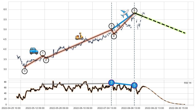 ➣ 突破缺口形成后,后续k已经超过14根,跳空突破波浪理论(5浪)关键点后, 出现【轻微回踩】迹象,短期高点影线回补缺口第二根k线高点