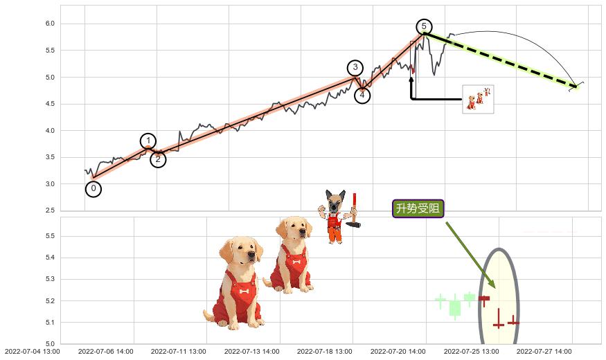 从2022-07-05 13:00至2022-07-25 13:00,共包含29个小时,阶段股价上涨0.07%,阶段股价变动位移路程比: 1 : 416