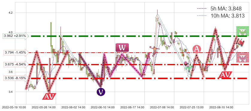 ♘ 阻力价格位3.962,可信任强度90.76%,距离最后交易2022-08-12 14:00形成的收盘价格3.850相差 +2.91%