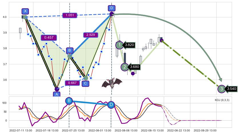 ➣ 已完成【蝙蝠】形态起点X: 07-07:14, 终点D: 08-01:13, 共34交易小时