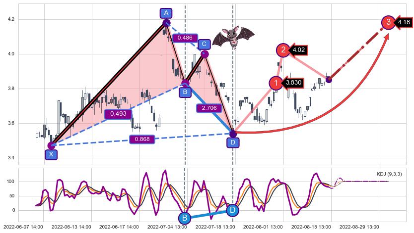 ➣ 已完成【蝙蝠】形态起点X: 06-08:11, 终点D: 07-15:14, 共77交易小时