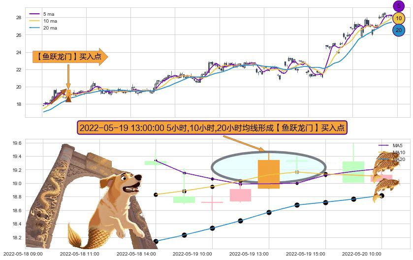⚀ 2022-05-19 13:00:00小时显现 5小时-10小时-20小时均线 【鱼跃龙门】买入点 看多信号,后市看涨,买入