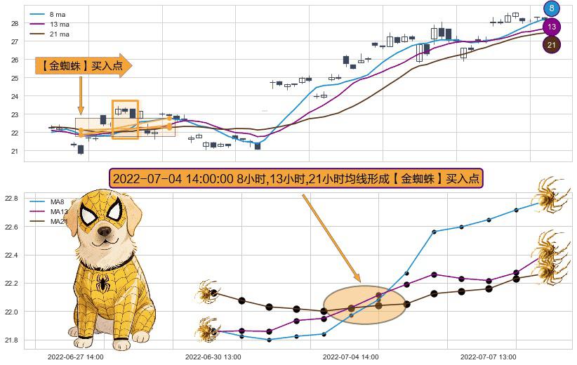 ⚀ 2022-07-04 14:00:00小时显现 8小时-13小时-21小时均线 【金蜘蛛】买入点 看多信号,后市看涨,买入