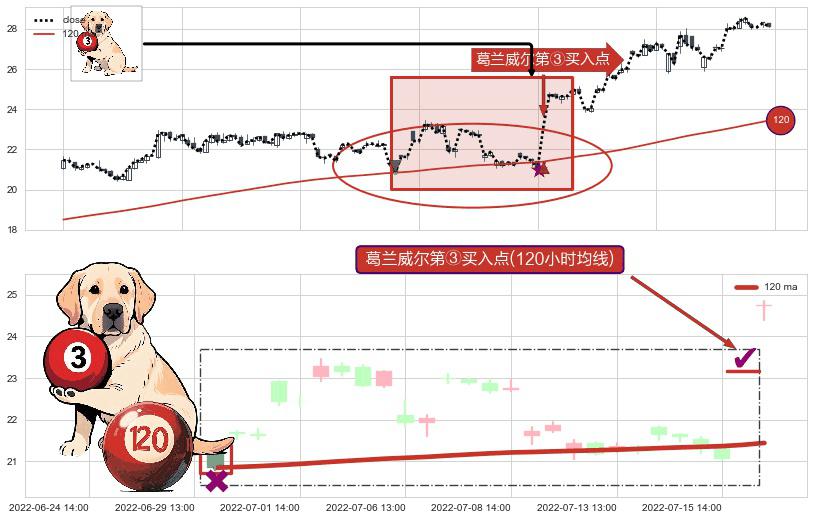 ⚀ 2022-07-18 13:00:00-小时显现 葛兰威尔均线 120小时均线 第③买入点 上升趋势的中继信号,后市看涨,买进信号