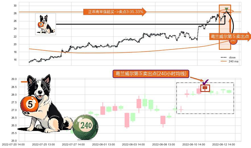 ⚀ 2022-08-10 14:00:00-小时显现 葛兰威尔均线 240小时均线 第⑤卖出点 上升趋势均值回复的短线回落信号,后市看跌,卖出信号