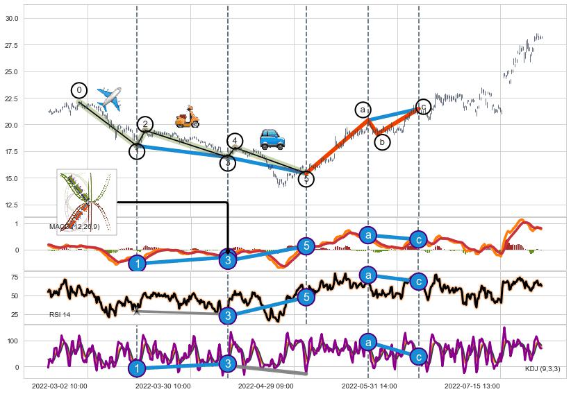➣ 1,3,5驱动浪MACD, RSI, KDJ走势都出现【常规背离】反转信号增强