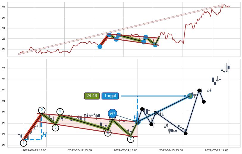 从2022-06-29 14:00至2022-07-15 14:00,共包含25个小时,阶段股价上涨1.75%,阶段股价变动位移路程比: 1 : 23