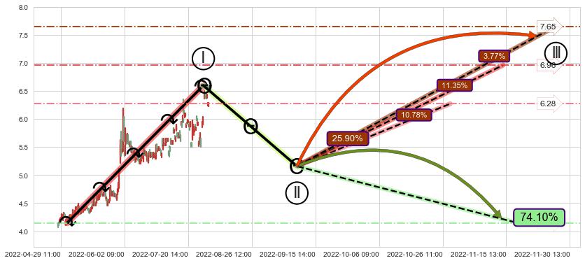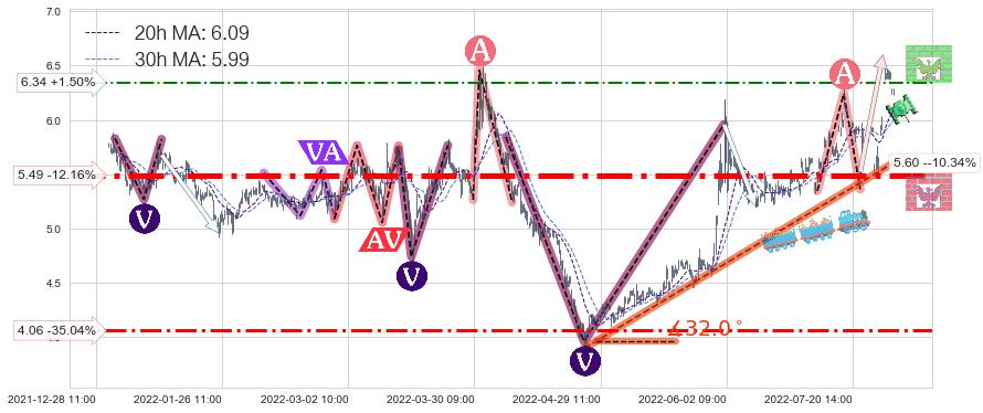 ♘ 支撑价格位5.49,可信任强度87.60%,距离最后交易2022-08-12 14:00形成的收盘价格6.25相差 -12.16%