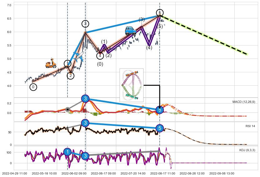 ➢ 1,3,5驱动浪MACD, RSI, KDJ走势都出现【常规背离】反转信号增强