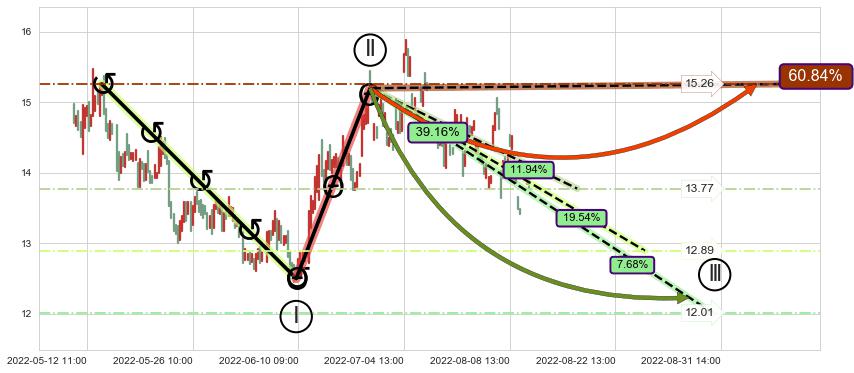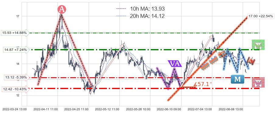 ♘ 阻力价格位14.87,可信任强度75.94%,距离最后交易2022-08-12 14:00形成的收盘价格13.87相差 +7.24%