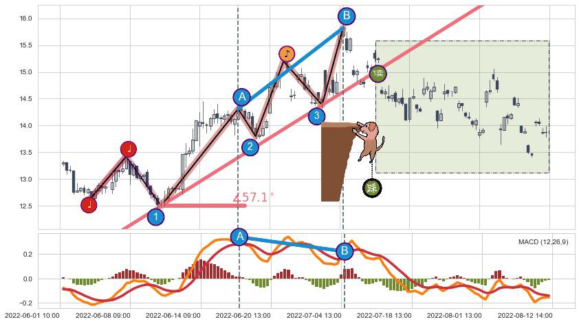 从2022-06-06 09:00至2022-07-15 13:00,共包含90个小时,阶段股价上涨14.10%,阶段股价变动位移路程比: 1 : 6,上涨趋势角度: 57.1