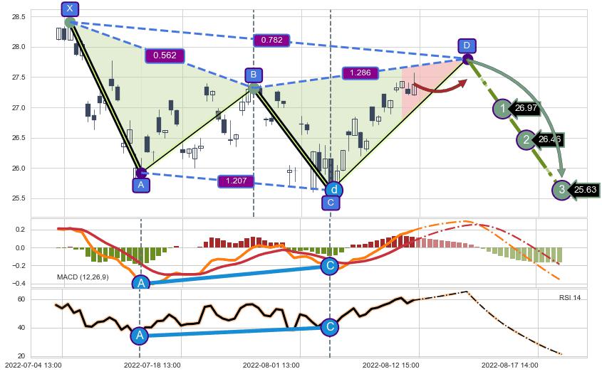 ➣ D点拟合预测价格27.80,距离最后交易收盘价格27.39相差 +1.51%