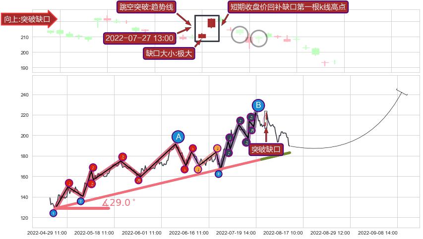 从2022-04-27 09:00至2022-07-22 14:00,共包含219个小时,阶段股价上涨53.82%,阶段股价变动位移路程比: 1 : 5,上涨趋势角度: 29.0,2022-06-30 13:00向⇪形成缺口,跳空上涨+10.00%