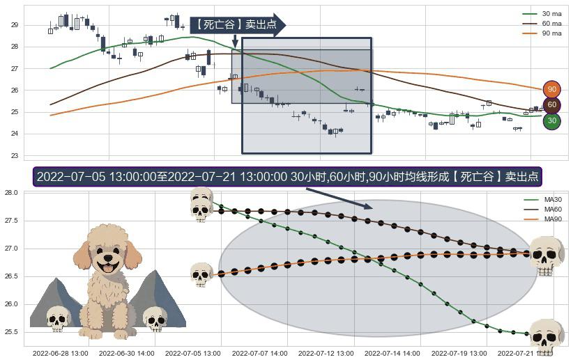 ⚀ 2022-07-05 14:00:00-小时至2022-07-21 13:00:00-小时显现 30小时-60小时-90小时均线 【死亡谷】卖出点 看空信号,后市看跌,卖出