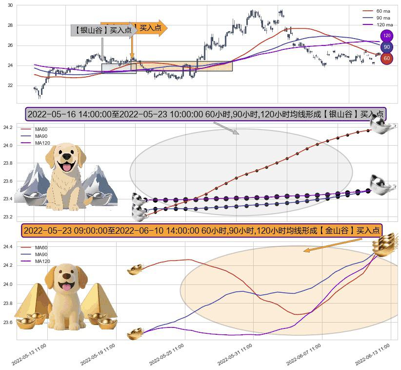 ⚃ 2022-05-23 10:00:00-小时至2022-06-10 14:00:00-小时显现 60小时-90小时-120小时均线 【金山谷】买入点 其再次确认了买入信号,可靠性更强,买入
