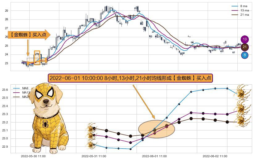 ⚀ 2022-06-01 10:00:00小时显现 8小时-13小时-21小时均线 【金蜘蛛】买入点 看多信号,后市看涨,买入