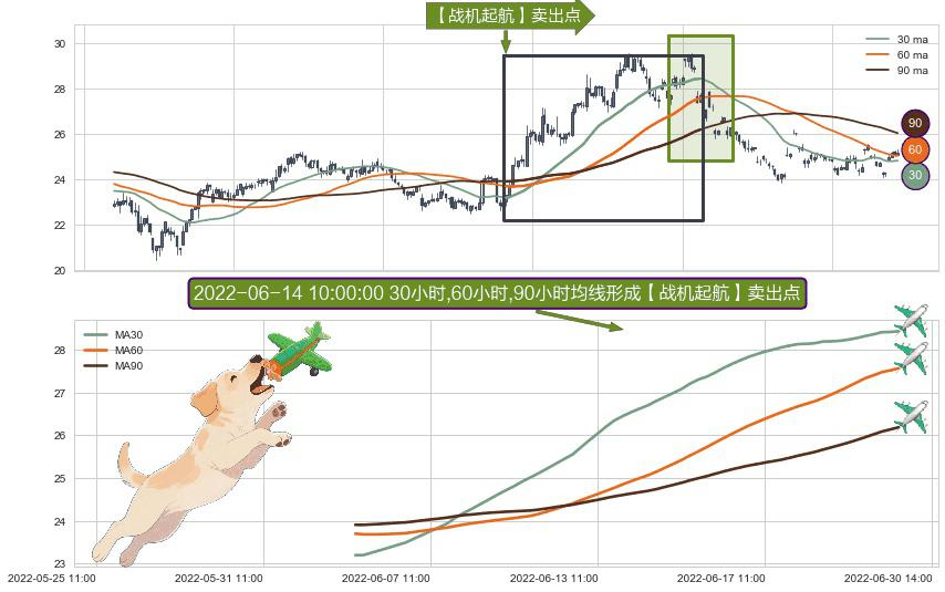 ⚀ 2022-06-02 13:00:00小时-2022-06-28 14:00:00小时显现 30小时-60小时-90小时均线 【战机起航】卖出点 看空信号,后市看跌,卖出