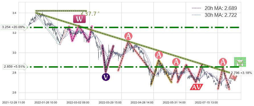 ♘ 阻力价格位2.859,可信任强度94.22%,距离最后交易2022-08-12 14:00形成的收盘价格2.710相差 +5.51%