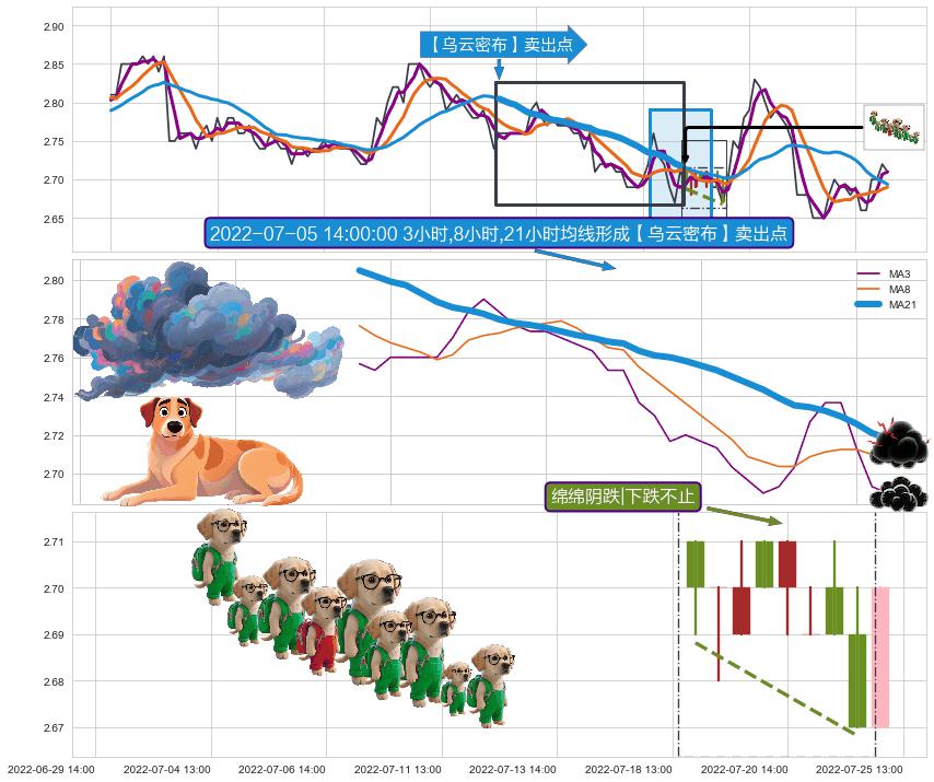 从2022-07-05 14:00至2022-07-22 13:00,共包含26个小时,阶段股价下跌-3.25%,阶段股价变动位移路程比: 1 : 3