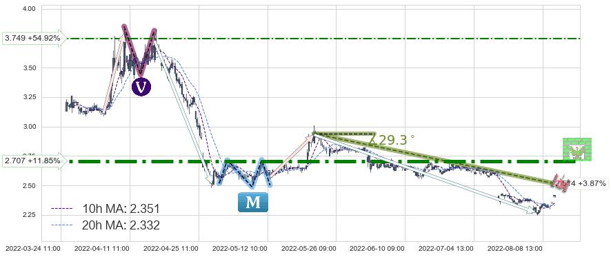 ♘ 阻力价格位3.749,可信任强度54.78%,距离最后交易2022-08-12 14:00形成的收盘价格2.420相差 +54.92%