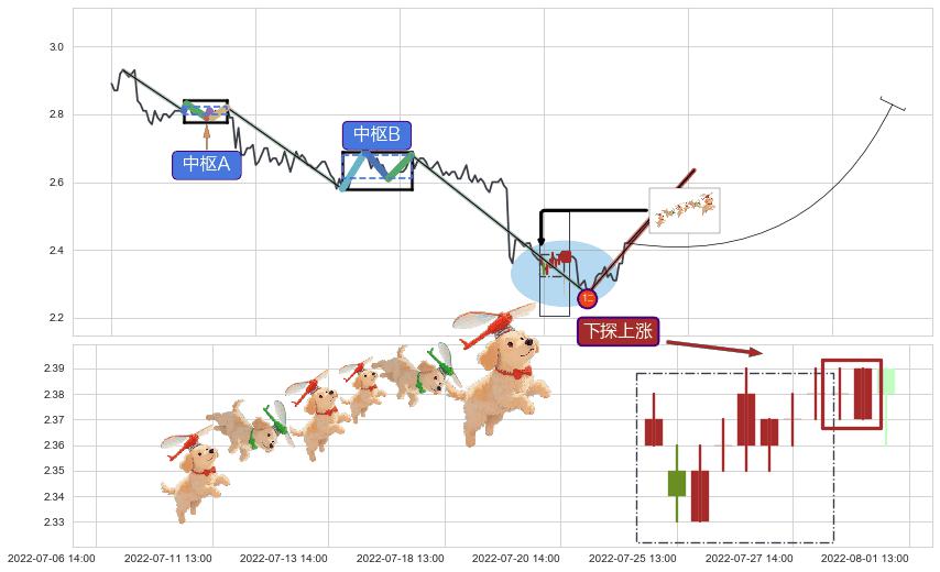 从2022-06-22 13:00至2022-08-11 14:00,共包含74个小时,阶段股价下跌-12.12%,阶段股价变动位移路程比: 1 : 4,下跌趋势角度: 58.1,2022-07-15 13:00向↘︎形成缺口,跳空下跌-7.75%˚
