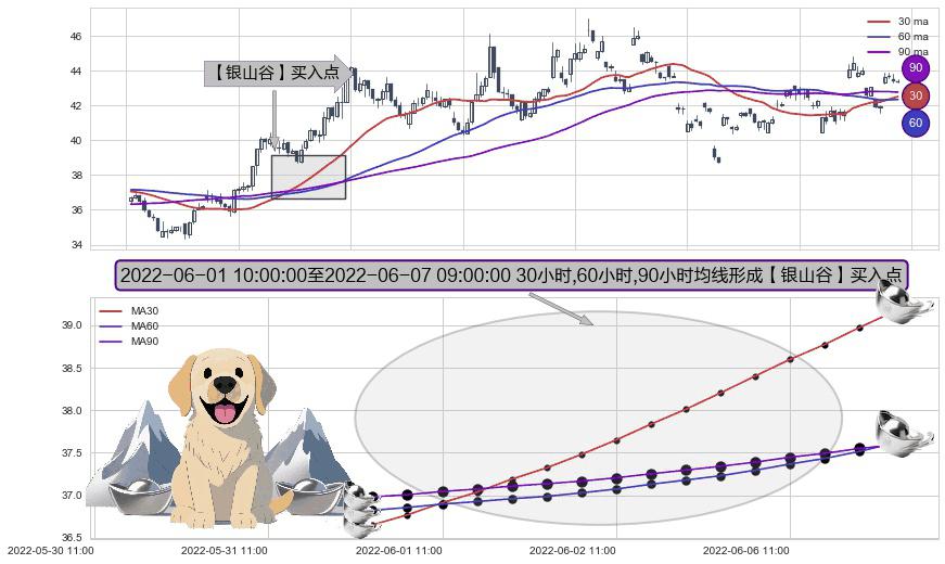 形态多维评估: ⚀ 2022-06-01 11:00:00-小时至2022-06-07 09:00:00-小时显现 30小时-60小时-90小时均线 【银山谷】买入点 看多信号,后市看涨,买入