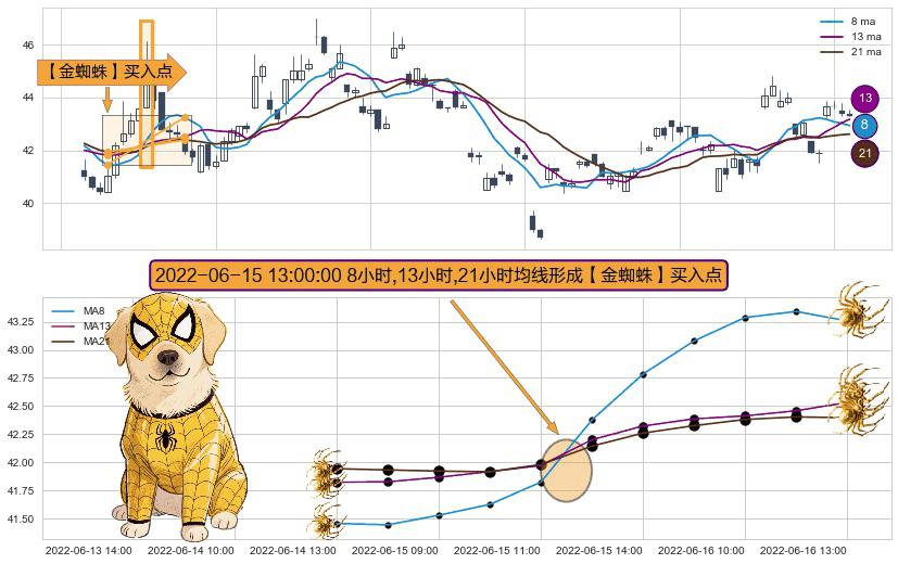 形态多维评估: ⚀ 2022-06-15 13:00:00小时显现 8小时-13小时-21小时均线 【金蜘蛛】买入点 看多信号,后市看涨,买入