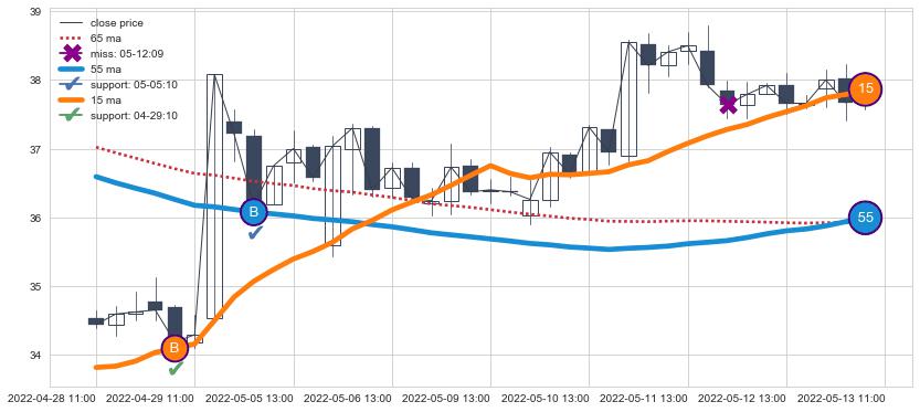 上涨趋势04-28 11:00-05-13 11:00,均线15, 55确认关键支撑2处