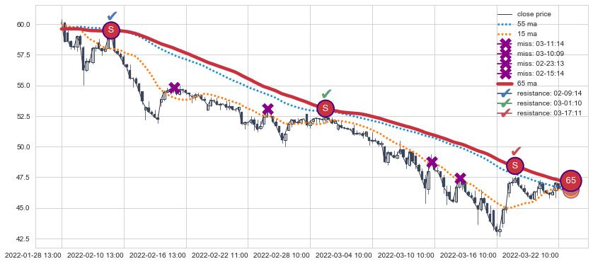 下跌趋势01-28 13:00-03-22 11:00,均线65确认关键阻力3处