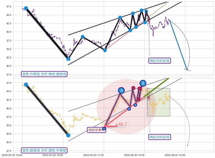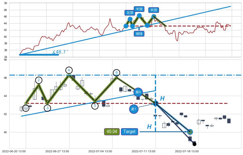 从2022-05-26 09:00至2022-06-30 14:00,共包含98个小时,阶段股价上涨24.29%,阶段股价变动位移路程比: 1 : 5,上涨趋势角度: 48.7